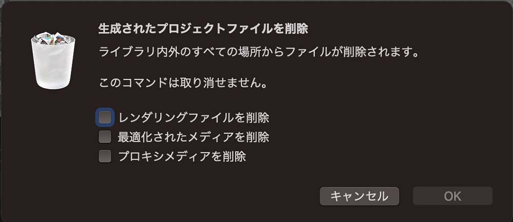 ライブラリー内のクリップに関連する、全ての最適化メディア、プロキシメディア、レンダリングファイルが対象になります。レンダリングファイルの削除では、「すべて」か「不要ファイルのみ」を選択できます。