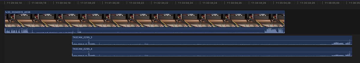 FX30の設定を29.97fpsDFにして撮影したビデオクリップとDR-701Dで録音したオーディオクリップとを同期処理すると、タイムコードと音声波形がかなり近い同期クリップが仕上がります。1、2フレームの誤差をタイムコードを基準に手動で修正した同期クリップのタイムラインがa02_fig_02です。