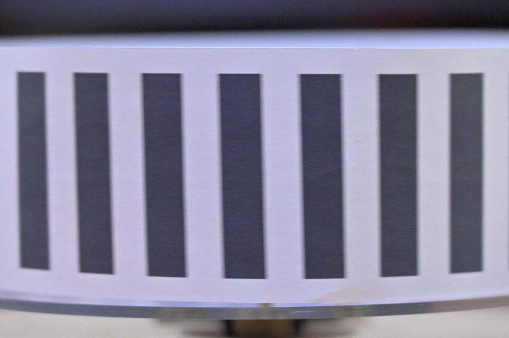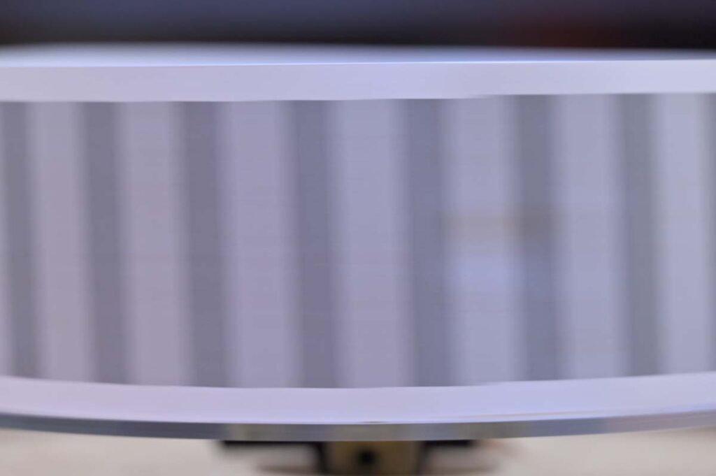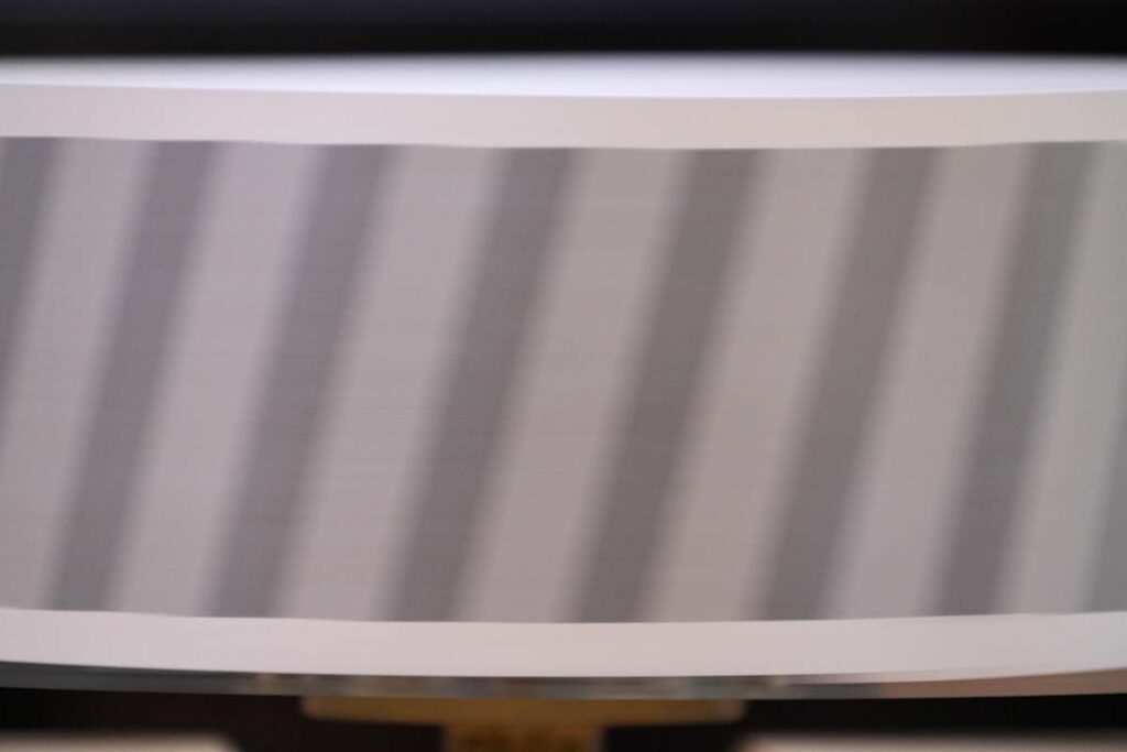ローリングシャッターによる歪みは現れていません。シャッターが開いている1/50秒の露光時間の間に歪みが生じない仕組みがよく分からないのですが、メカニカルシャッターが加わることで歪みの発生を防いでいるようです。ただし、画面中央付近でローリングシャッターで発生する歪みとは逆向きに傾いているように見えます。円筒状の被写体なので、画面中央付近が縦縞の移動速度は最も速いことと関係あるかもしれません。