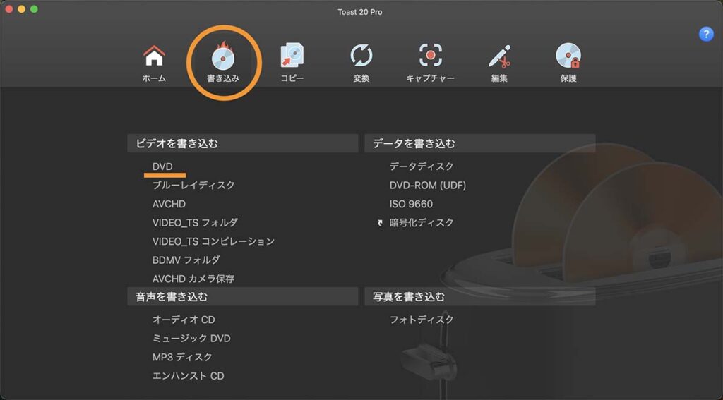 Toast20proを起動したら、上部のボタンで「書き込み」を選択し(丸囲み部分)、「DVD」(下線部分)を選択でDVD作成画面が開く