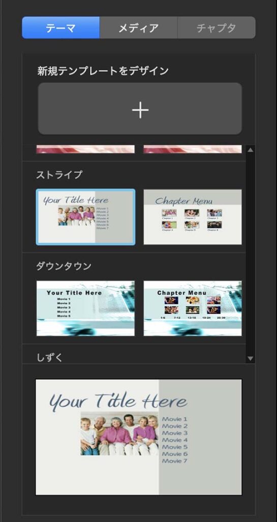 ここでは、プリインストールされたプリセットメニューの中では比較的シンプルな「ストライプ」を選びました。このプリセットは、1枚のDVDに最大7タイトルを収録できる雛形メニューです。今回は、1タイトルを収録したDVDを作成します。