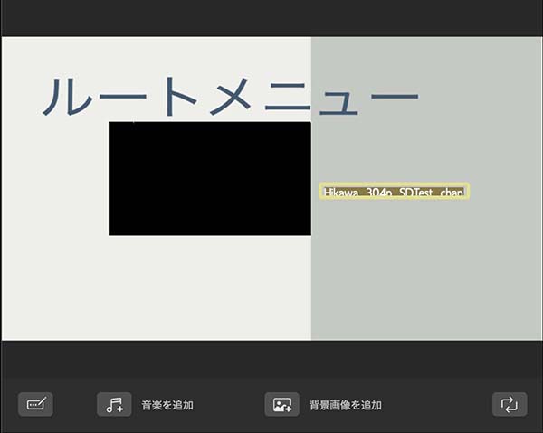 「ルートメニュー」の文言は、ディスクのタイトルがわかりやすいと思います。このプリセットは英語フォントでデザインされているので、英数字を使って書き換えた方が見栄え良く仕上がります。和文フォントを使うと、文字が大きすぎて間の抜けたデザインになってしまいます。なお、プリインストールされたプリセットメニューを使う場合、メニューの文字サイズの変更はできません。