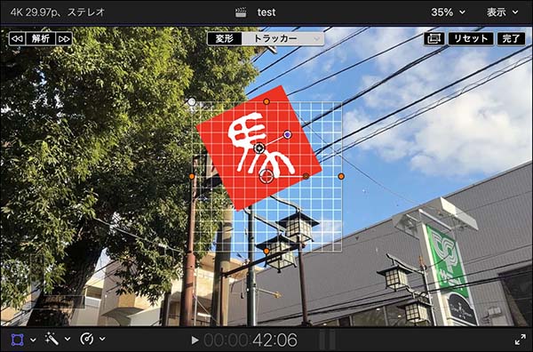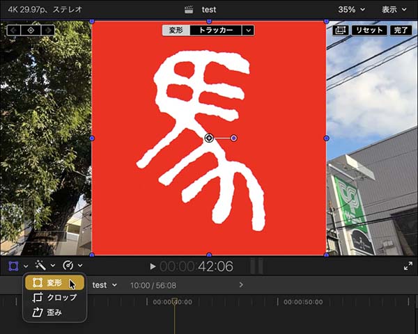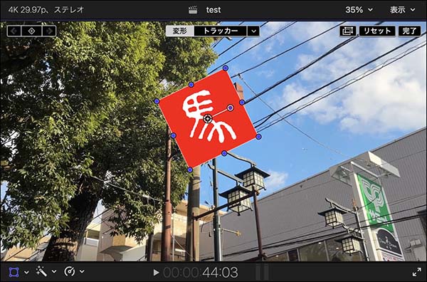 png画像などオブジェクトの位置やサイズ、角度を変更する場合は、解析前に画面上部の「変形」ボタンを選択して調整します。あるいは「トラッカー」ボタンが選択されたままでも、ビデオインスペクタのパラメータを操作して形状を変更することができます。