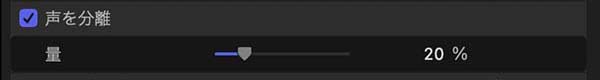 スライダーで、ノイズの除去量を調節します。10から30%程度で、十分に効果が出ます。「声を分離」と同様に、強くかけ過ぎると、使いたい音声に歪みが生じます。エフェクトの効き具合を、ヘッドホンで確認しながら設定した方が安心です。