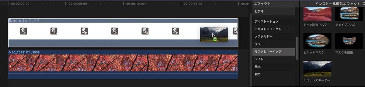 ここで使用する素材は61_fig_02の白黒ハンコの画像と、前回使用した紅葉の動画クリップです。タイムラインで紅葉のクリップの上に白黒ハンコの画像クリップを配置し、白黒ハンコのクリップに「ルミナンスキーヤー」を適用します(61_fig_04)。