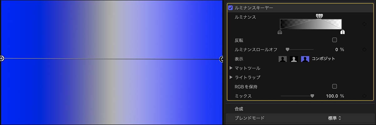 青いバックカラークリップの上にグラデーションクリップを配置して、ルミナンスキーヤーを適用