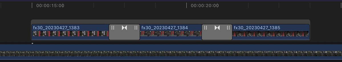 3個のクリップ群の接続部分にトランジションを適用
