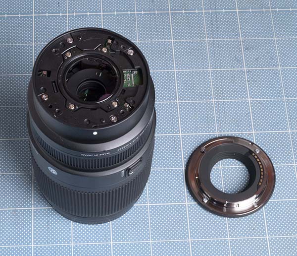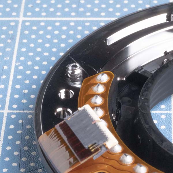 SIGMA16-300mmの紹介でも記載したとおりレンズの鏡胴部分はプラスチック製で、マウントを支えるネジを留めるネジ山ごと抜けてしまい、螺旋に切られたネジ部分にはプラスチック片が絡まっていました。まさに「もげた」という状態です。レンズ内の基盤とマウントの電機接点をつなぐフレキシブル基盤も、コネクター部が破損して千切れた状態です。