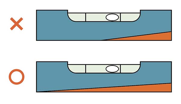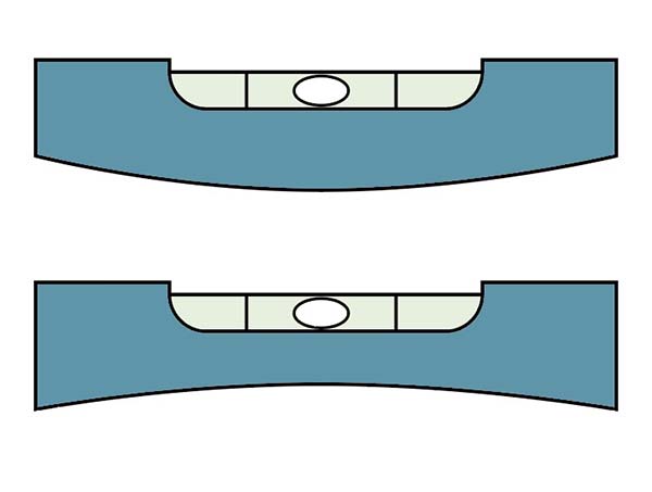 また、tr_fig_02のように、底面が丸くならないようにも気をつけます。底面が凸型になってしまうと、水準器自体が傾いて正確に測れません。凹型の場合両端部分が接地すれば問題ありませんが、水準器をのせる面が水準器よりも小さい時には、水準器が傾く原因になります。