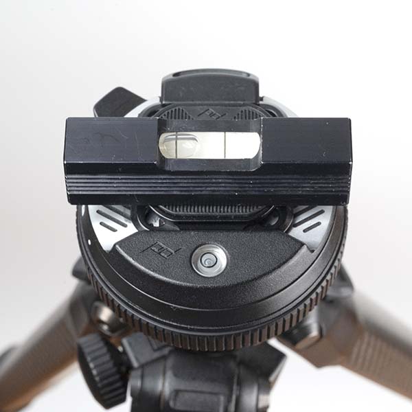 雲台部分に付属のマンフロット互換カメラプレートを取り付けて、その面に水準器をのせてみました。三脚ヘッドに取り付けられた水準器で水平を合わせると、若干傾いているようです。